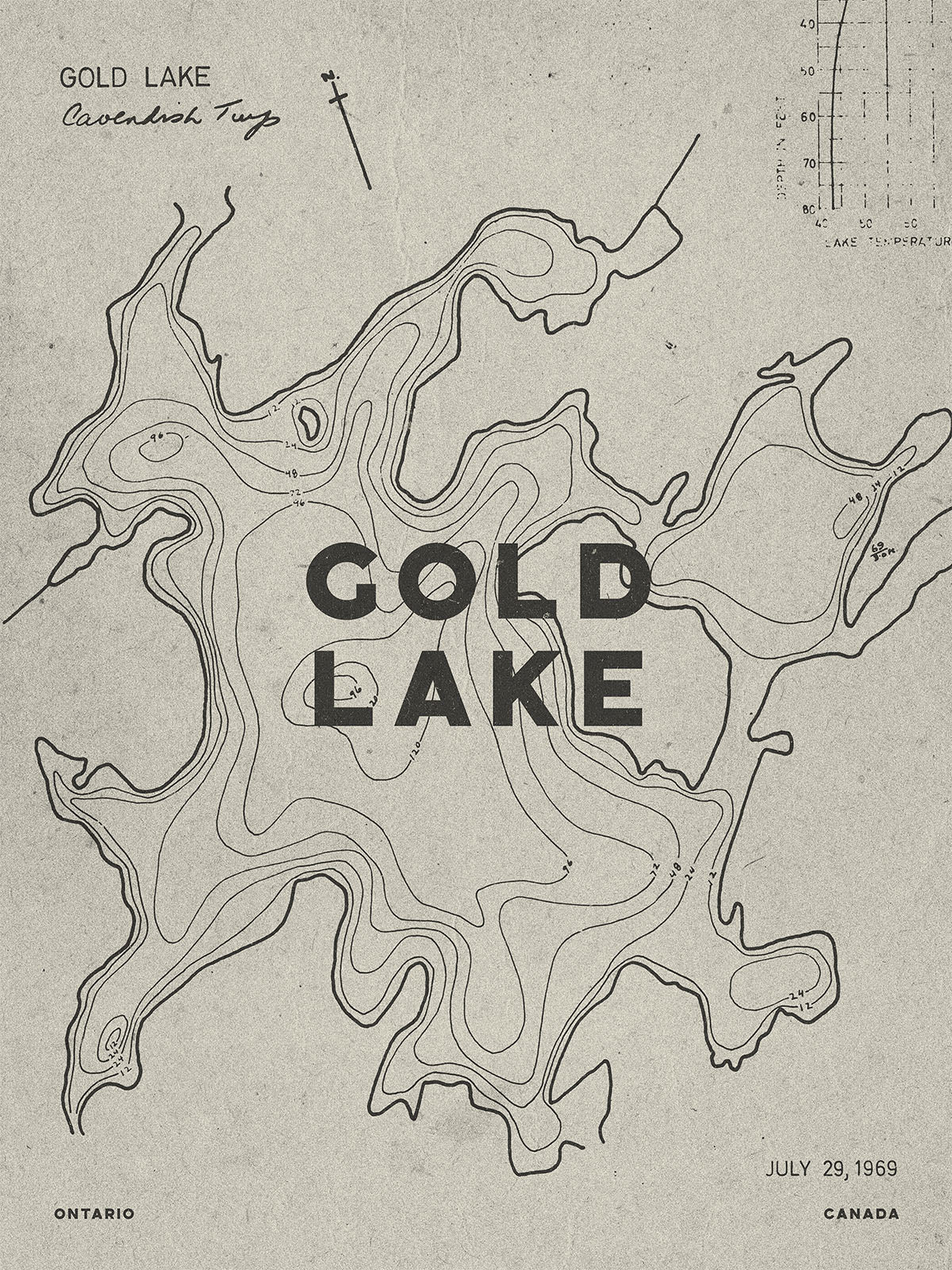Based on original Gold Lake contour maps from the archives of the Ontario Ministry of Natural Resources, these interesting pieces of visual history have been re-imagined by Blue Moon Print Shop in a vintage style reminiscent of the era they are from (1950s-1970s). The design includes water depth and shoreline markings, as well as extras from the original