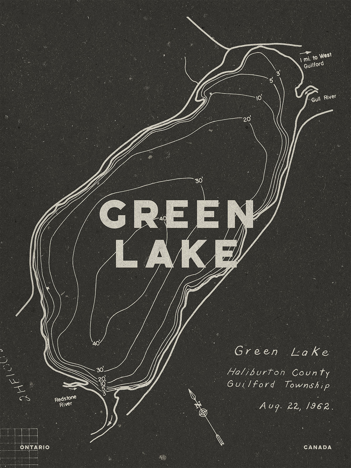Based on original Green Lake contour maps from the archives of the Ontario Ministry of Natural Resources, these interesting pieces of visual history have been re-imagined by Blue Moon Print Shop in a vintage style reminiscent of the era they are from (1950s-1970s). The design includes water depth and shoreline markings, as well as extras from the original