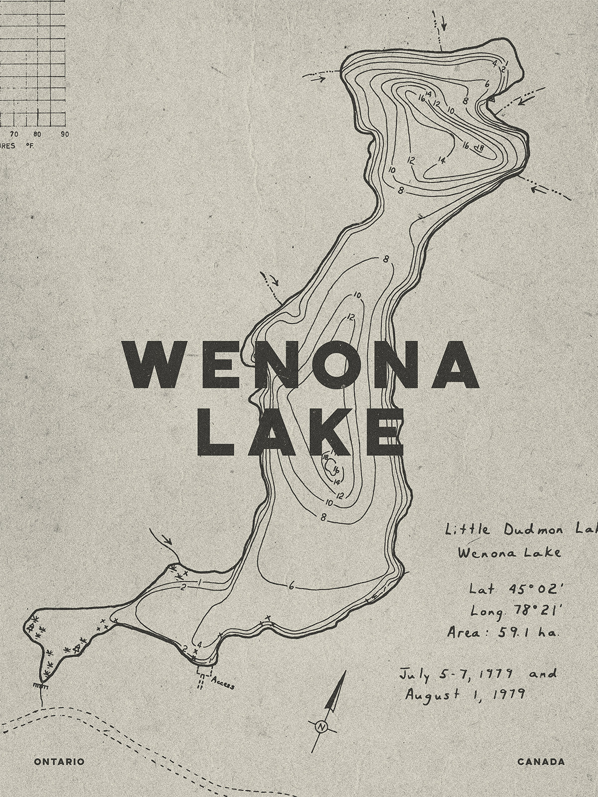Based on original Wenona Lake contour maps from the archives of the Ontario Ministry of Natural Resources, these interesting pieces of visual history have been re-imagined by Blue Moon Print Shop in a vintage style reminiscent of the era they are from (1950s-1970s). The design includes water depth and shoreline markings, as well as extras from the original